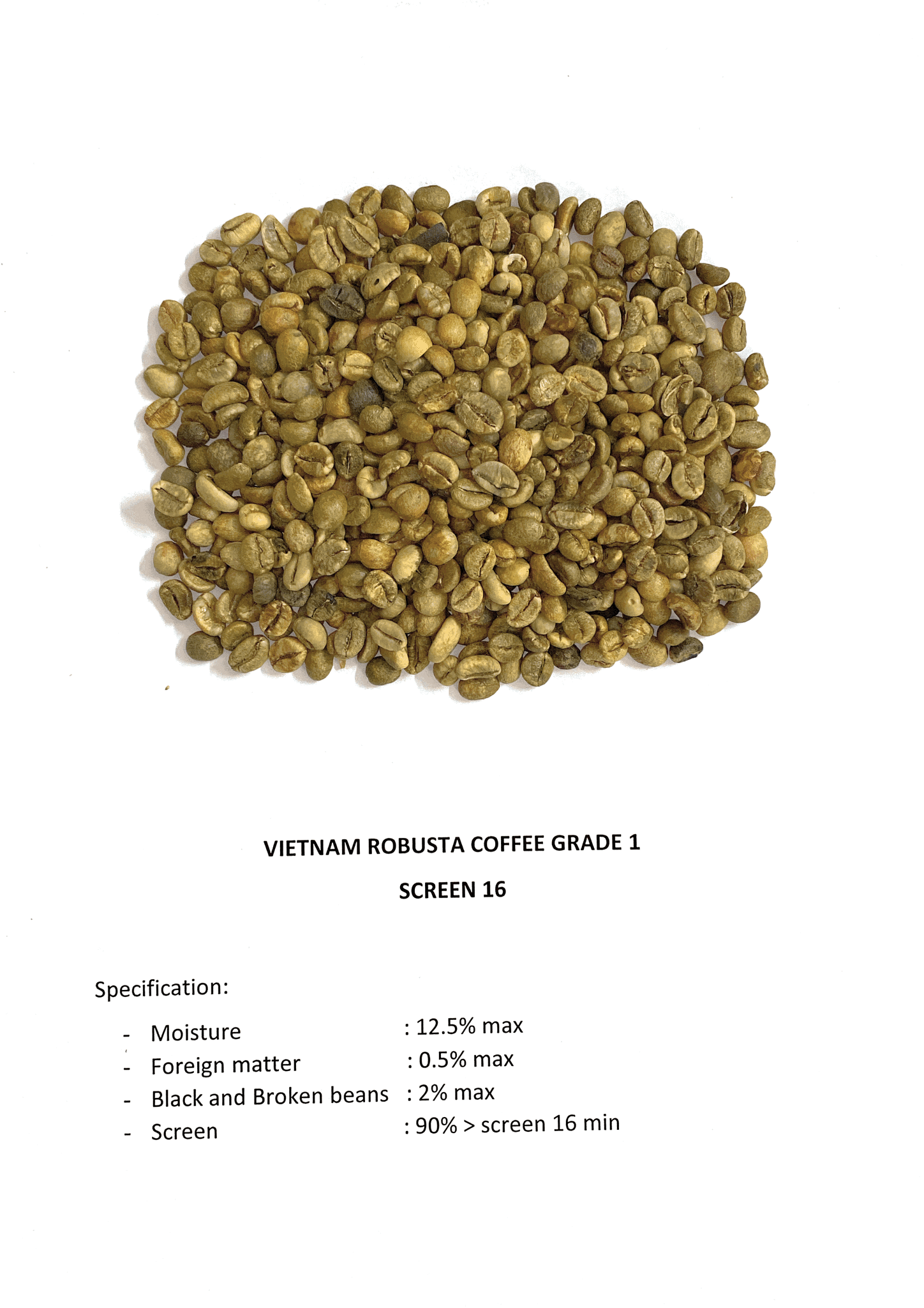 Humedad: 12,5% máx.Sustancia extraña: 0,5% máx.Granos negros y quebrados: 2% máx.Criba: 90%> criba 16 min.